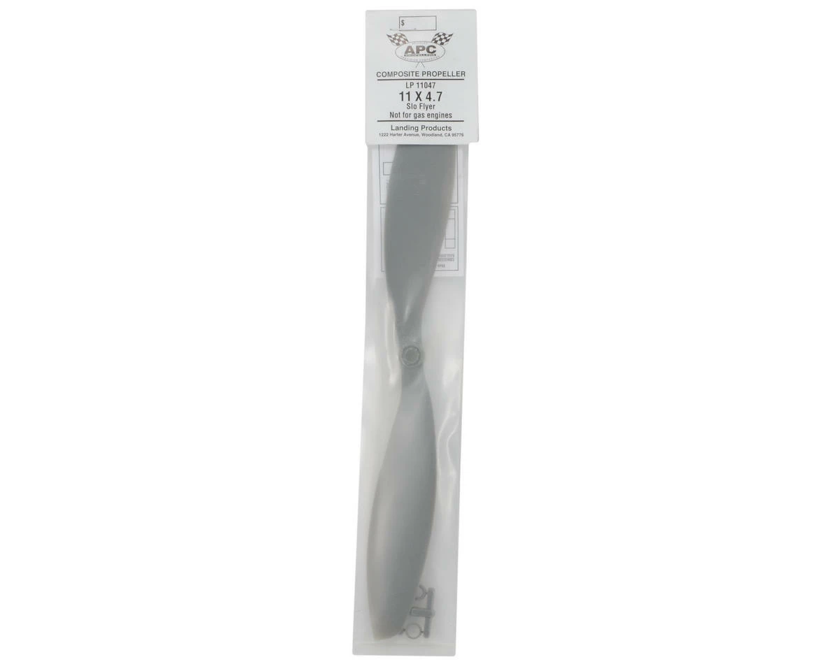 This is the APC 11×4.7 Slow Flyer Propeller. APC propellers are manufactured using a pultrusion process which allows for a higher fiber (60%) to resin (nylon binder) density. This provides substantially higher strength and stiffness than glass-filled nylon. The additional stiffness is beneficial to control vibration resonance response. The higher strength allows the use of thinner cross-sections, beneficial to weight and aerodynamic efficiency.