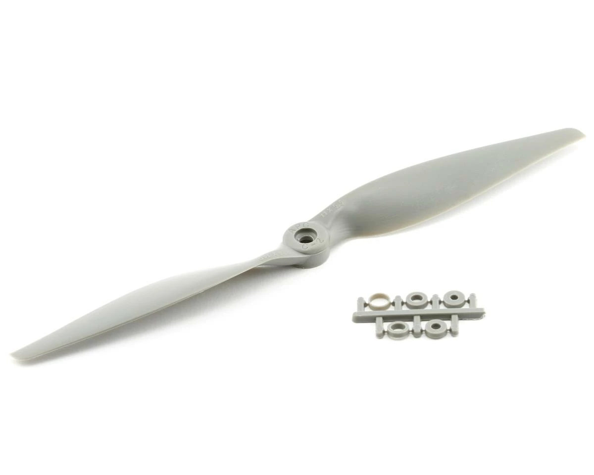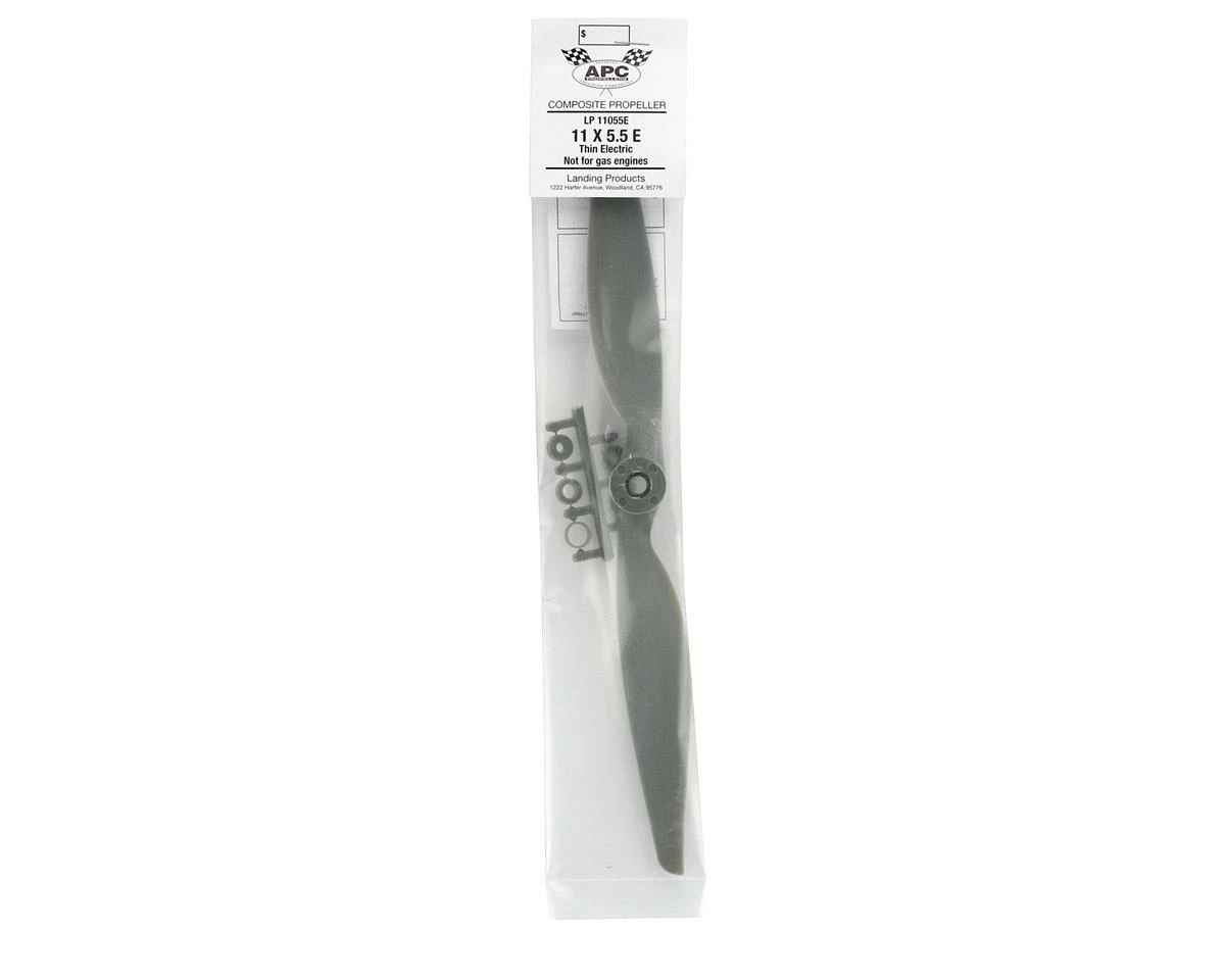 This is the APC 11×5.5 Thin Electric Propeller. APC propellers are manufactured using a pultrusion process which allows for a higher fiber (60%) to resin (nylon binder) density. This provides substantially higher strength and stiffness than glass-filled nylon. The additional stiffness is beneficial to control vibration resonance response. The higher strength allows the use of thinner cross-sections, beneficial to weight and aerodynamic efficiency.