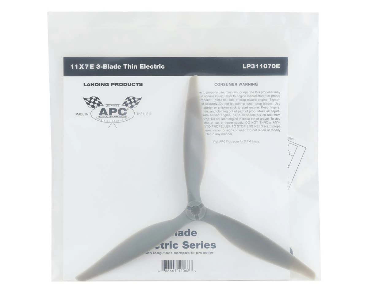 This is the APC 11x7E-3 Three Blade Propeller. APC propellers are manufactured using a pultrusion process which allows for a higher fiber (60%) to resin (nylon binder) density. This provides substantially higher strength and stiffness than glass-filled nylon. The additional stiffness is beneficial to control vibration resonance response. The higher strength allows the use of thinner cross-sections, beneficial to weight and aerodynamic efficiency.