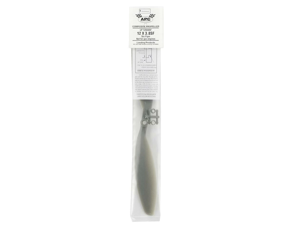 This is the APC 12×3.8 Slow Flyer Propeller. APC propellers are manufactured using a pultrusion process which allows for a higher fiber (60%) to resin (nylon binder) density. This provides substantially higher strength and stiffness than glass-filled nylon. The additional stiffness is beneficial to control vibration resonance response. The higher strength allows the use of thinner cross-sections, beneficial to weight and aerodynamic efficiency.