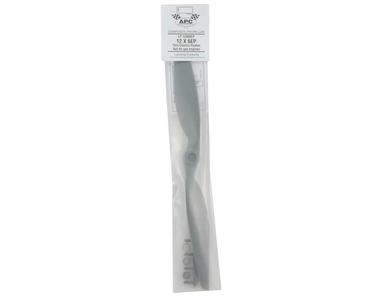 This is the APC 12×6 Thin Electric Pusher Propeller. APC propellers are manufactured using a pultrusion process which allows for a higher fiber (60%) to resin (nylon binder) density. This provides substantially higher strength and stiffness than glass-filled nylon. The additional stiffness is beneficial to control vibration resonance response. The higher strength allows the use of thinner cross-sections, beneficial to weight and aerodynamic efficiency.