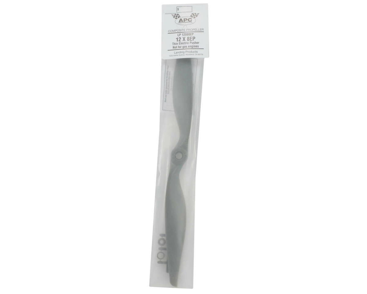 This is the APC 12×8 Thin Electric Pusher Propeller. APC propellers are manufactured using a pultrusion process which allows for a higher fiber (60%) to resin (nylon binder) density. This provides substantially higher strength and stiffness than glass-filled nylon. The additional stiffness is beneficial to control vibration resonance response. The higher strength allows the use of thinner cross-sections, beneficial to weight and aerodynamic efficiency.