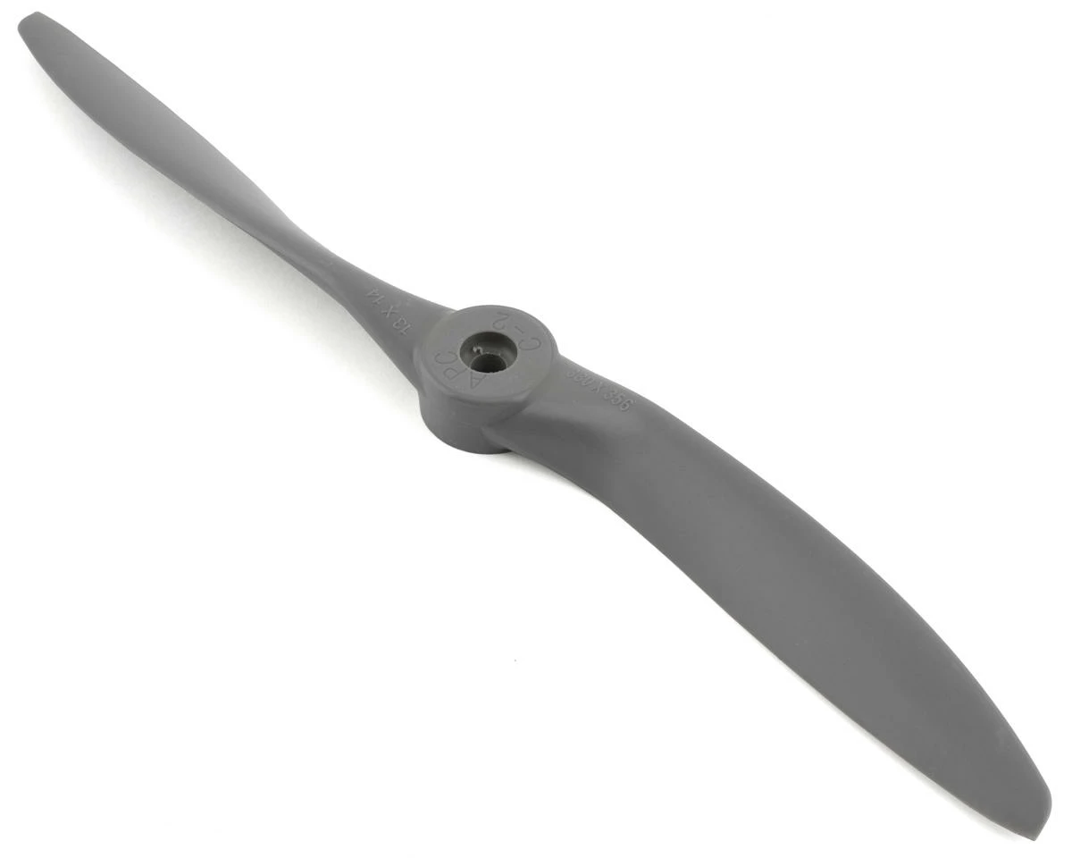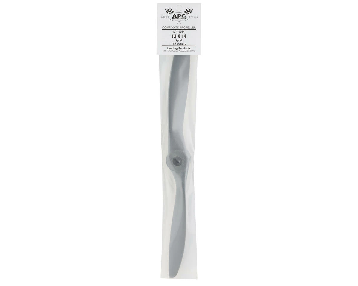 This is the APC 13×14 115 Warbird Sport Propeller. APC propellers are manufactured using a pultrusion process which allows for a higher fiber (60%) to resin (nylon binder) density. This provides substantially higher strength and stiffness than glass-filled nylon. The additional stiffness is beneficial to control vibration resonance response. The higher strength allows the use of thinner cross-sections, beneficial to weight and aerodynamic efficiency.