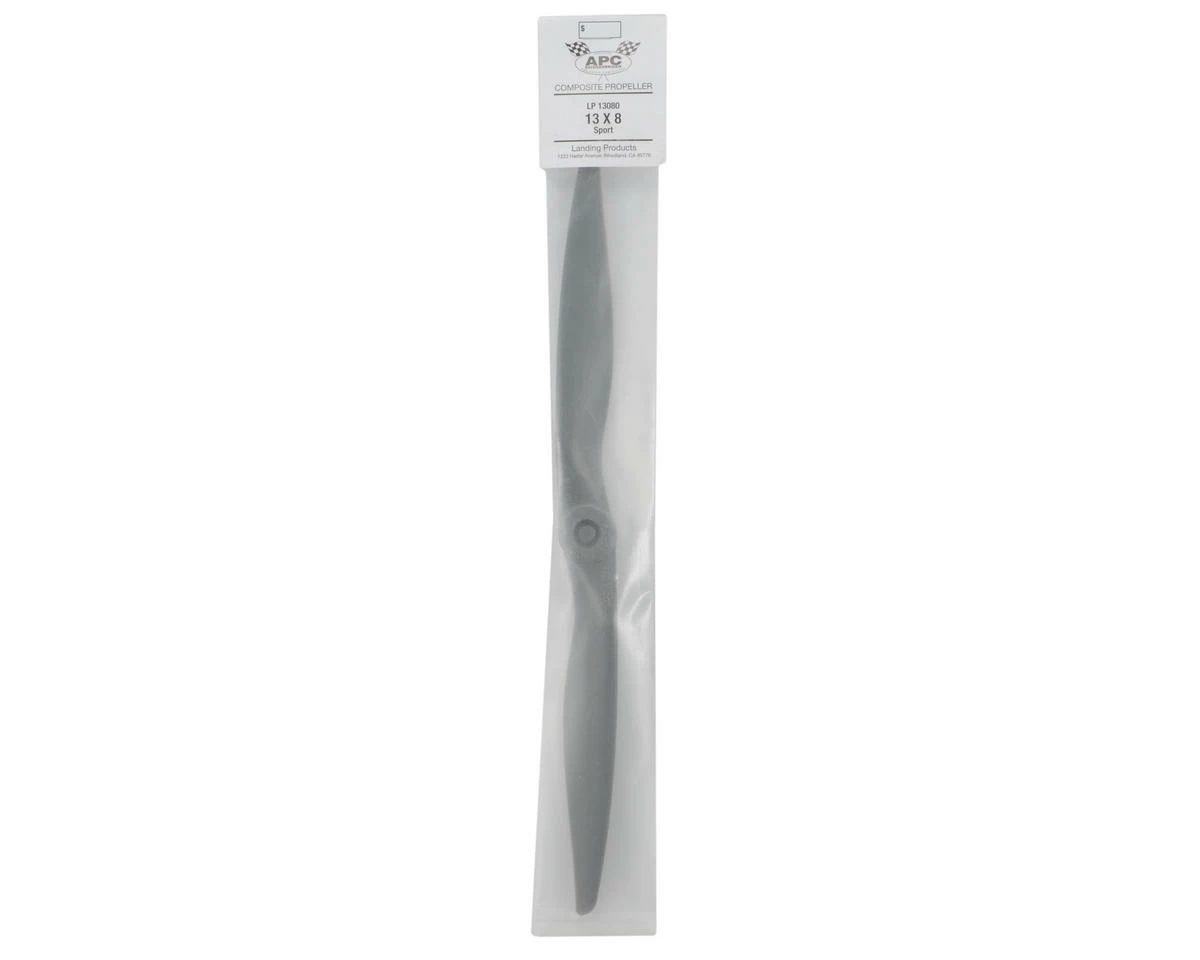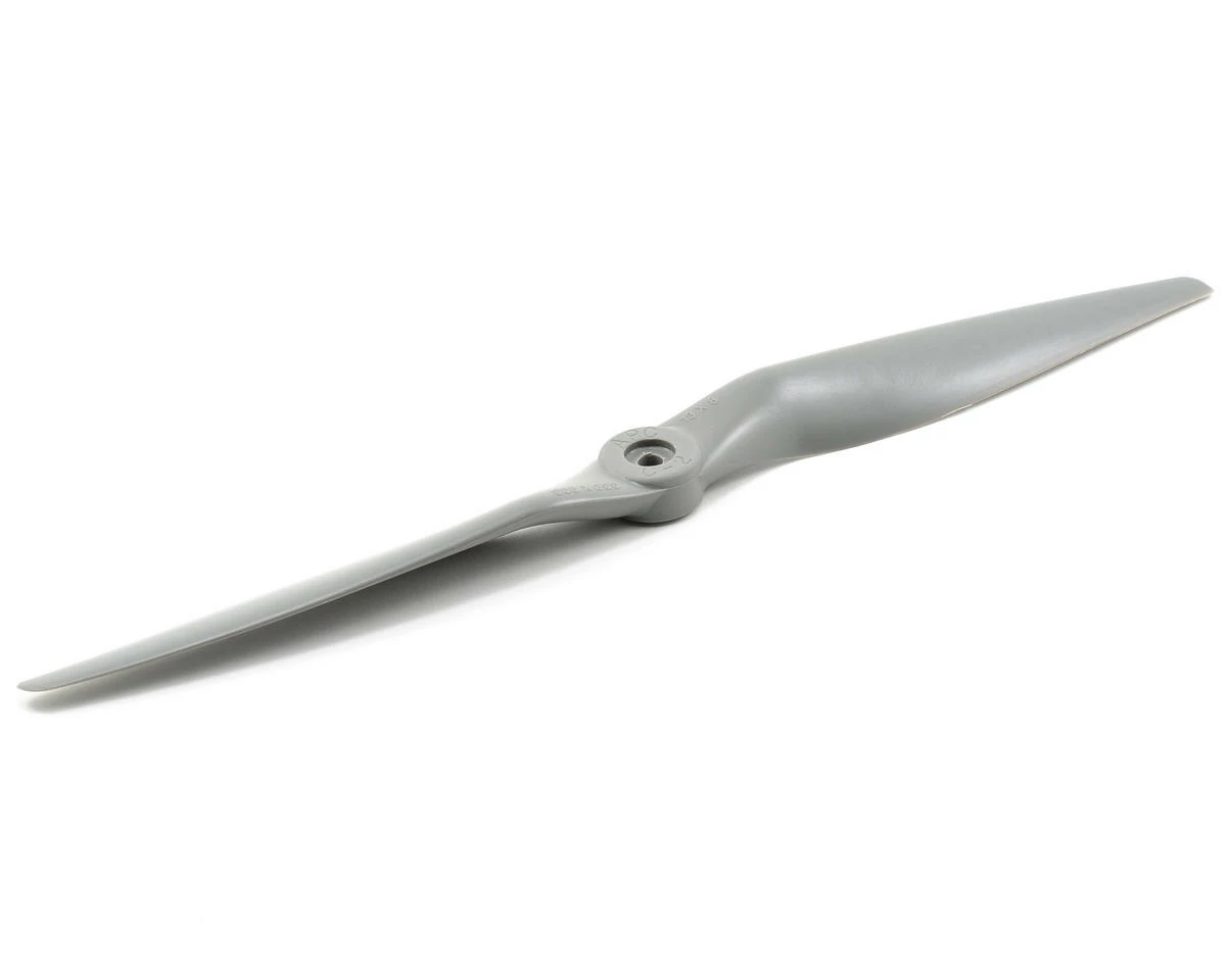 This is the APC 13×8 Sport Propeller. APC propellers are manufactured using a pultrusion process which allows for a higher fiber (60%) to resin (nylon binder) density. This provides substantially higher strength and stiffness than glass-filled nylon. The additional stiffness is beneficial to control vibration resonance response. The higher strength allows the use of thinner cross-sections, beneficial to weight and aerodynamic efficiency.