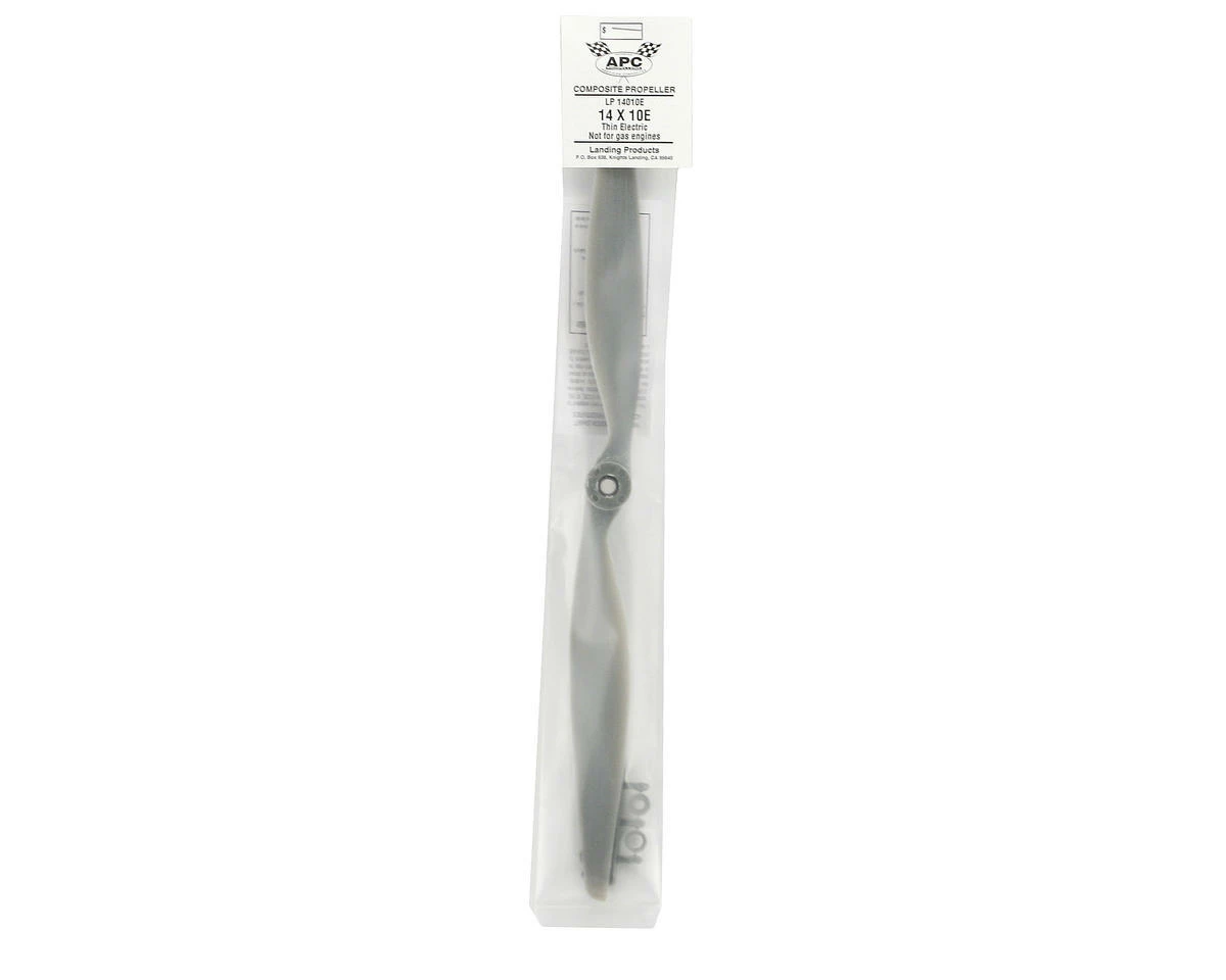 This is the APC 14×10 Thin Electric Propeller. APC propellers are manufactured using a pultrusion process which allows for a higher fiber (60%) to resin (nylon binder) density. This provides substantially higher strength and stiffness than glass-filled nylon. The additional stiffness is beneficial to control vibration resonance response. The higher strength allows the use of thinner cross-sections, beneficial to weight and aerodynamic efficiency.