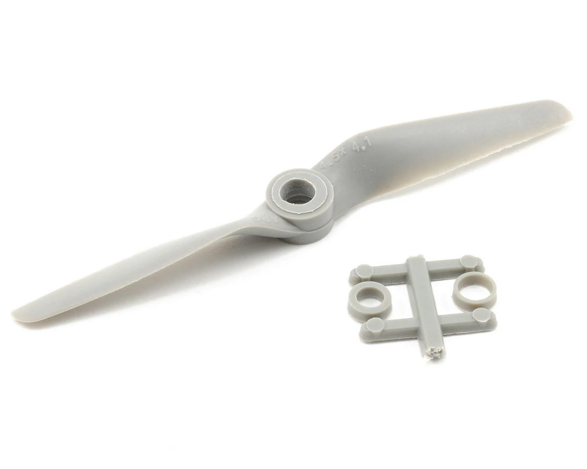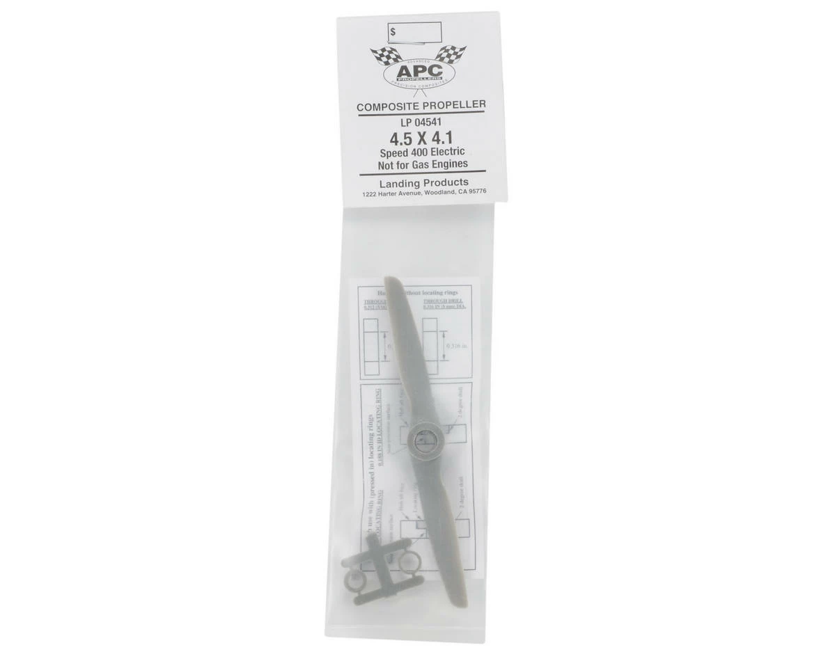 This is the APC 4.5×4.1 Speed 400 Electric Propeller. APC propellers are manufactured using a pultrusion process which allows for a higher fiber (60%) to resin (nylon binder) density. This provides substantially higher strength and stiffness than glass-filled nylon. The additional stiffness is beneficial to control vibration resonance response. The higher strength allows the use of thinner cross-sections, beneficial to weight and aerodynamic efficiency.