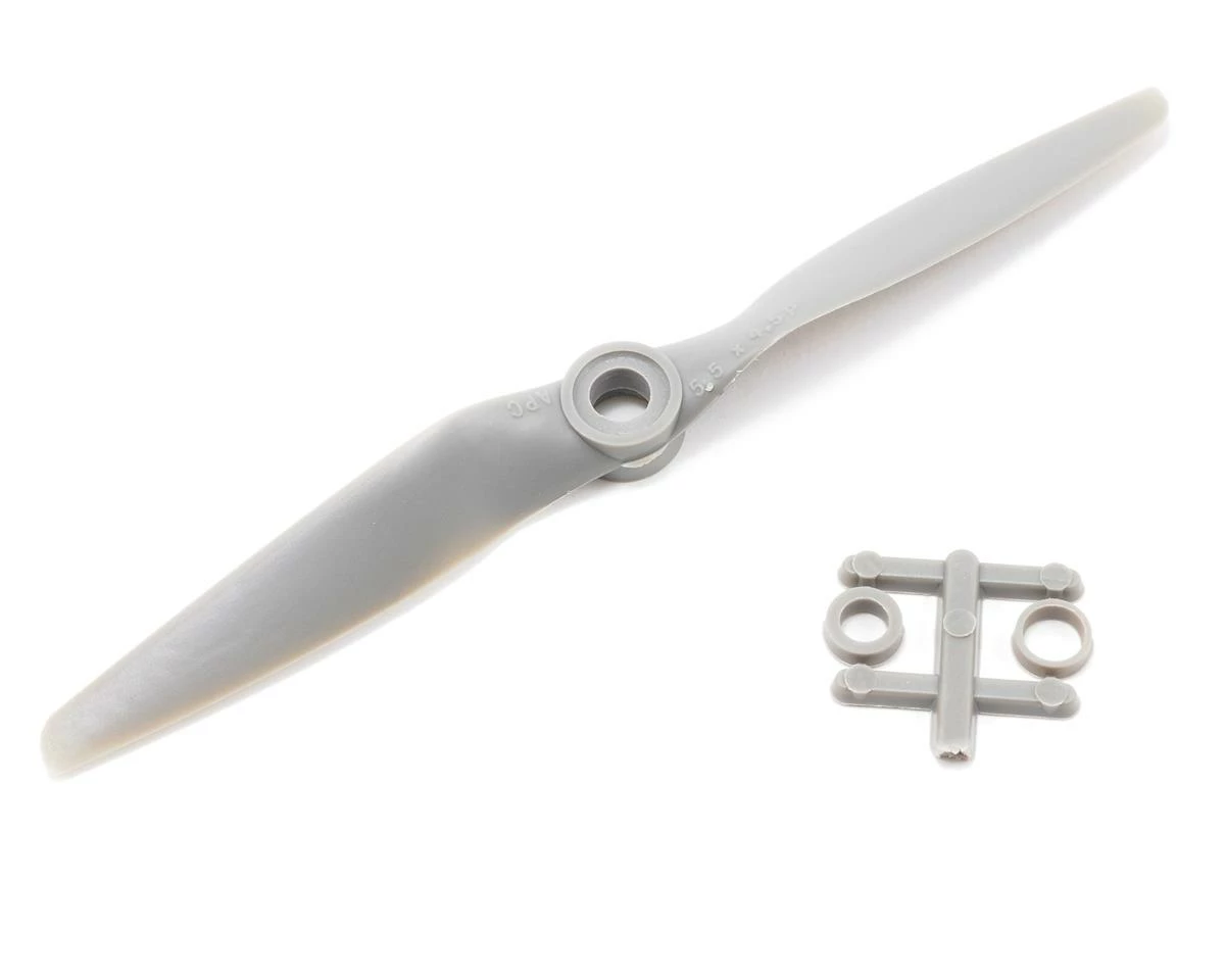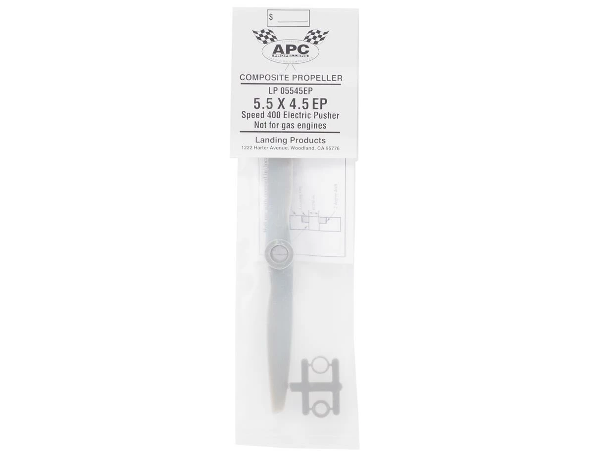 This is the APC 5.5×4.5E Speed 400 Pusher Propeller. APC propellers are manufactured using a pultrusion process which allows for a higher fiber (60%) to resin (nylon binder) density. This provides substantially higher strength and stiffness than glass-filled nylon. The additional stiffness is beneficial to control vibration resonance response. The higher strength allows the use of thinner cross-sections, beneficial to weight and aerodynamic efficiency.