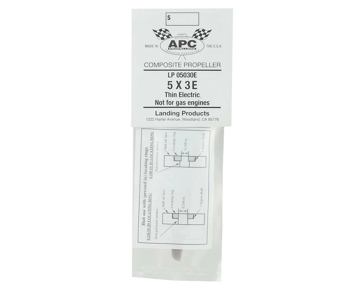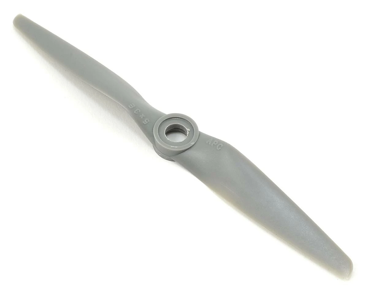 This is the APC 5×3 Thin Electric Propeller. APC propellers are manufactured using a pultrusion process which allows for a higher fiber (60%) to resin (nylon binder) density. This provides substantially higher strength and stiffness than glass-filled nylon. The additional stiffness is beneficial to control vibration resonance response. The higher strength allows the use of thinner cross-sections, beneficial to weight and aerodynamic efficiency.