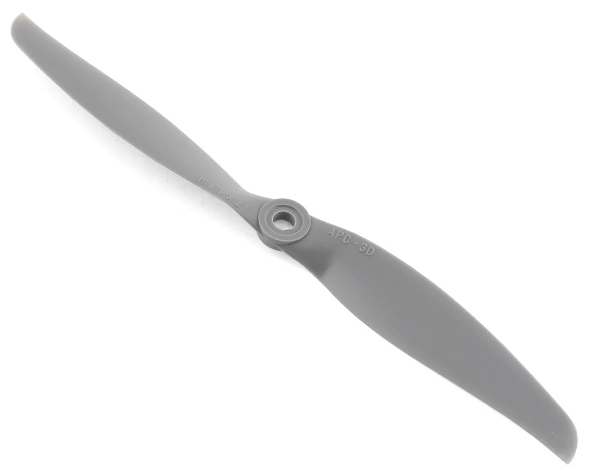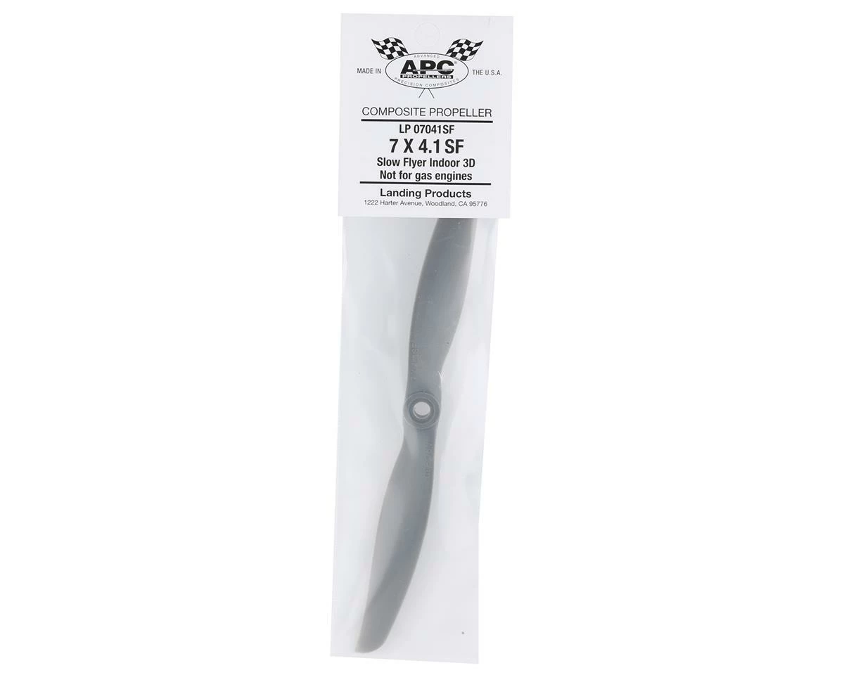 This is the APC 7×4.1 Slow Flyer “SF3D” Propeller. APC propellers are manufactured using a pultrusion process which allows for a higher fiber (60%) to resin (nylon binder) density. This provides substantially higher strength and stiffness than glass-filled nylon. The additional stiffness is beneficial to control vibration resonance response. The higher strength allows the use of thinner cross-sections, beneficial to weight and aerodynamic efficiency.