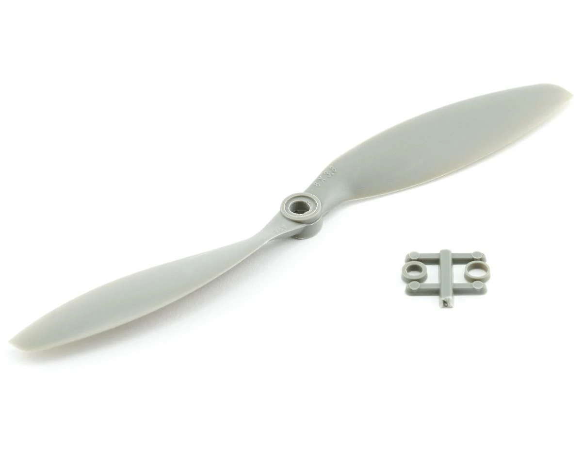 This is the APC 8×3.8 Slow Flyer Propeller. APC propellers are manufactured using a pultrusion process which allows for a higher fiber (60%) to resin (nylon binder) density. This provides substantially higher strength and stiffness than glass-filled nylon. The additional stiffness is beneficial to control vibration resonance response. The higher strength allows the use of thinner cross-sections, beneficial to weight and aerodynamic efficiency.