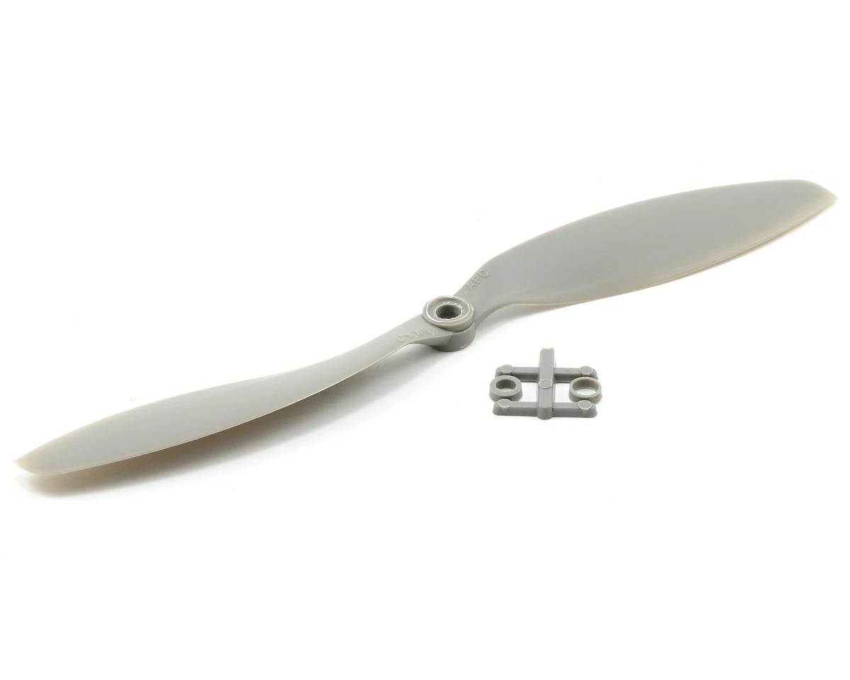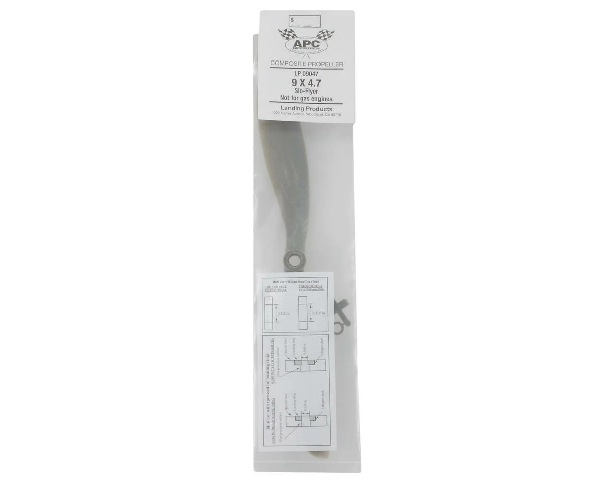 This is the APC 9×4.7 Slow Flyer Propeller. APC propellers are manufactured using a pultrusion process which allows for a higher fiber (60%) to resin (nylon binder) density. This provides substantially higher strength and stiffness than glass-filled nylon. The additional stiffness is beneficial to control vibration resonance response. The higher strength allows the use of thinner cross-sections, beneficial to weight and aerodynamic efficiency.
