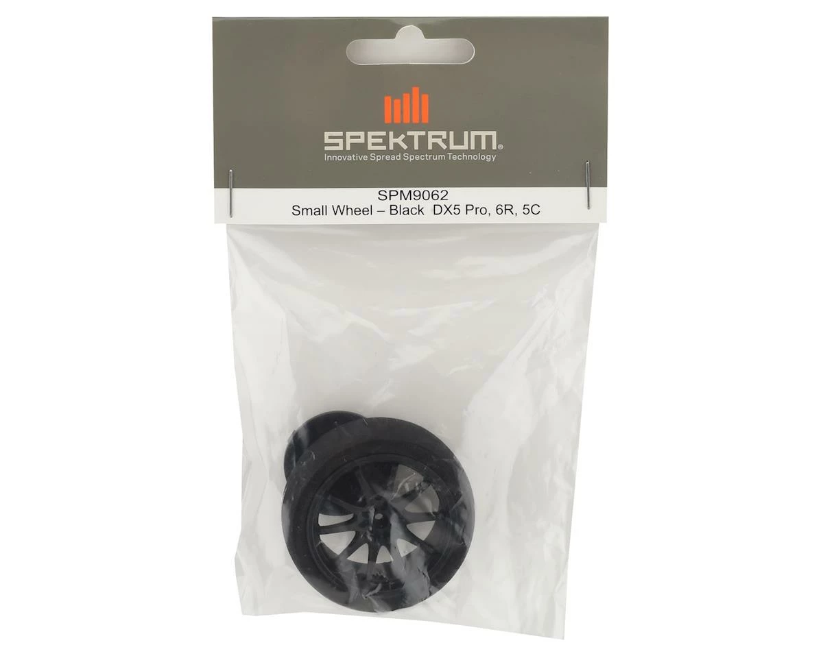 This a Spektrum RC Small Black Wheel, intended for use with the Spektrum RC DX5C, 5R Pro, and 6R radios.